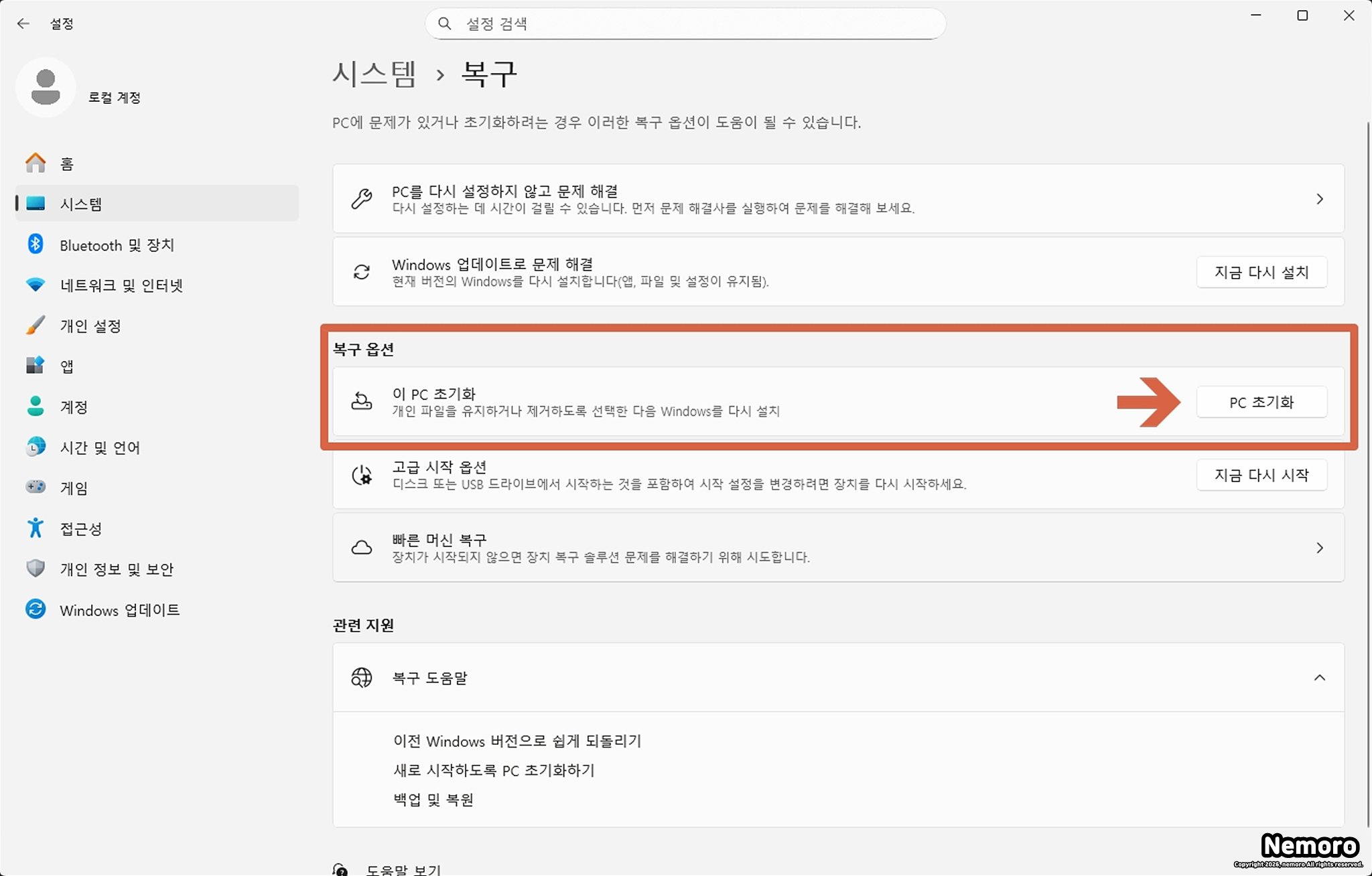 PC 초기화 시작하기