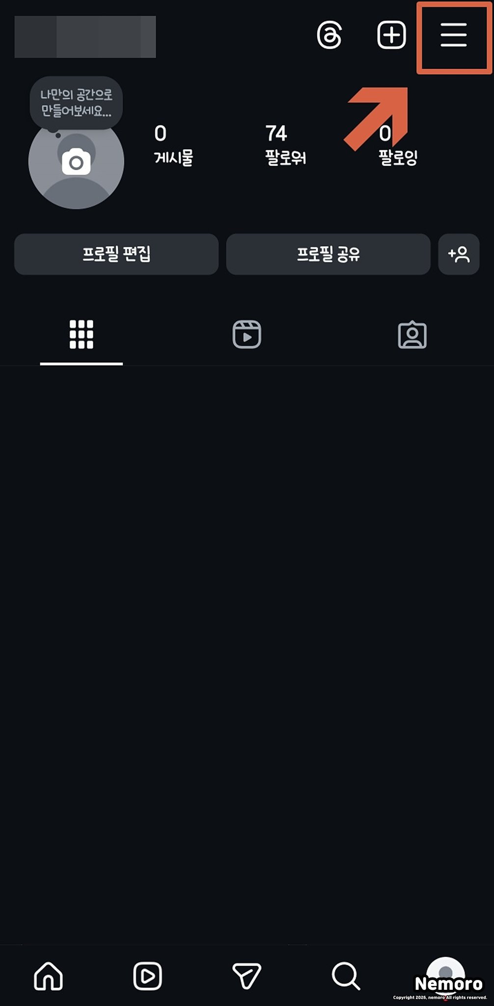 인트사그램 비공개 계정 전환은 인스타그램 설정에서 가능합니다. 먼저 인스타그램을 실행해 주신 후에 자신의 피드로 이동해 주세요. 그리고 오른쪽 상단에 있는 [≡] 메뉴 버튼을 선택해 주시면 됩니다.