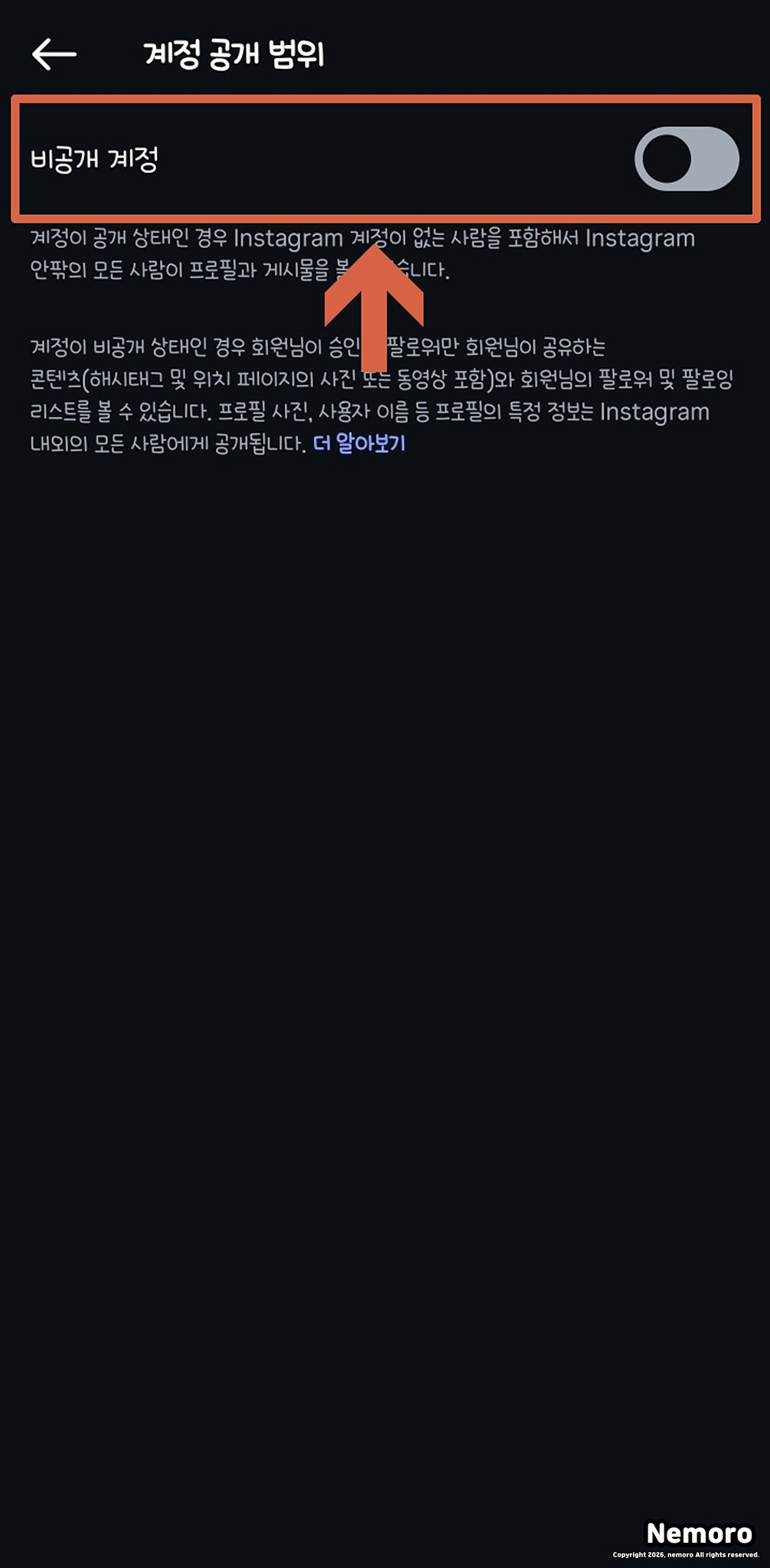 - 비공개 계정 푸는 방법은 비공개 계정으로 설정하는 방법과 동일합니다. 비공개 계정 오른쪽 핸들박스를 다시 꺼주시면 전체 공개 계정으로 전환됩니다.
