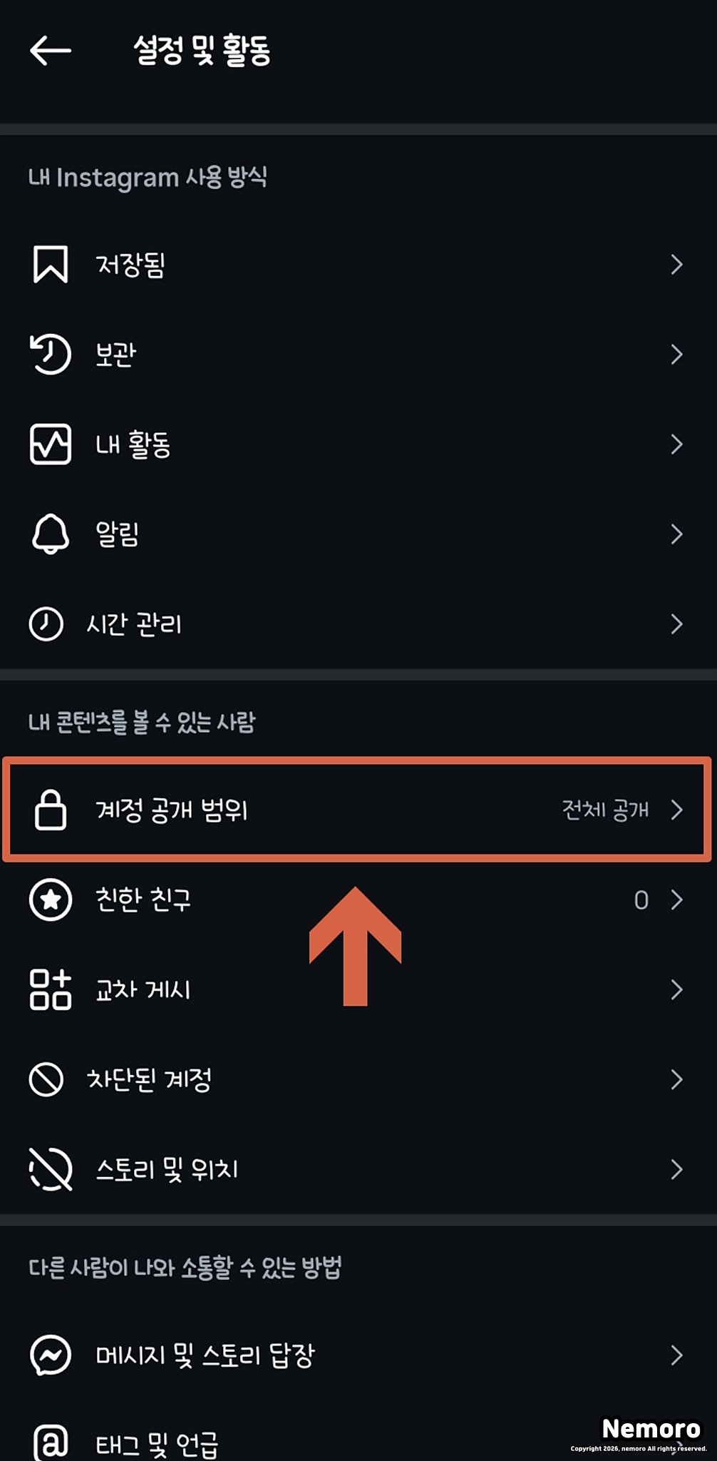 설정 및 활동 페이지로 이동하면 [내 콘텐츠를 볼 수 있는 사람] 탭에서 [계정 공개 범위]를 선택해 주세요.
