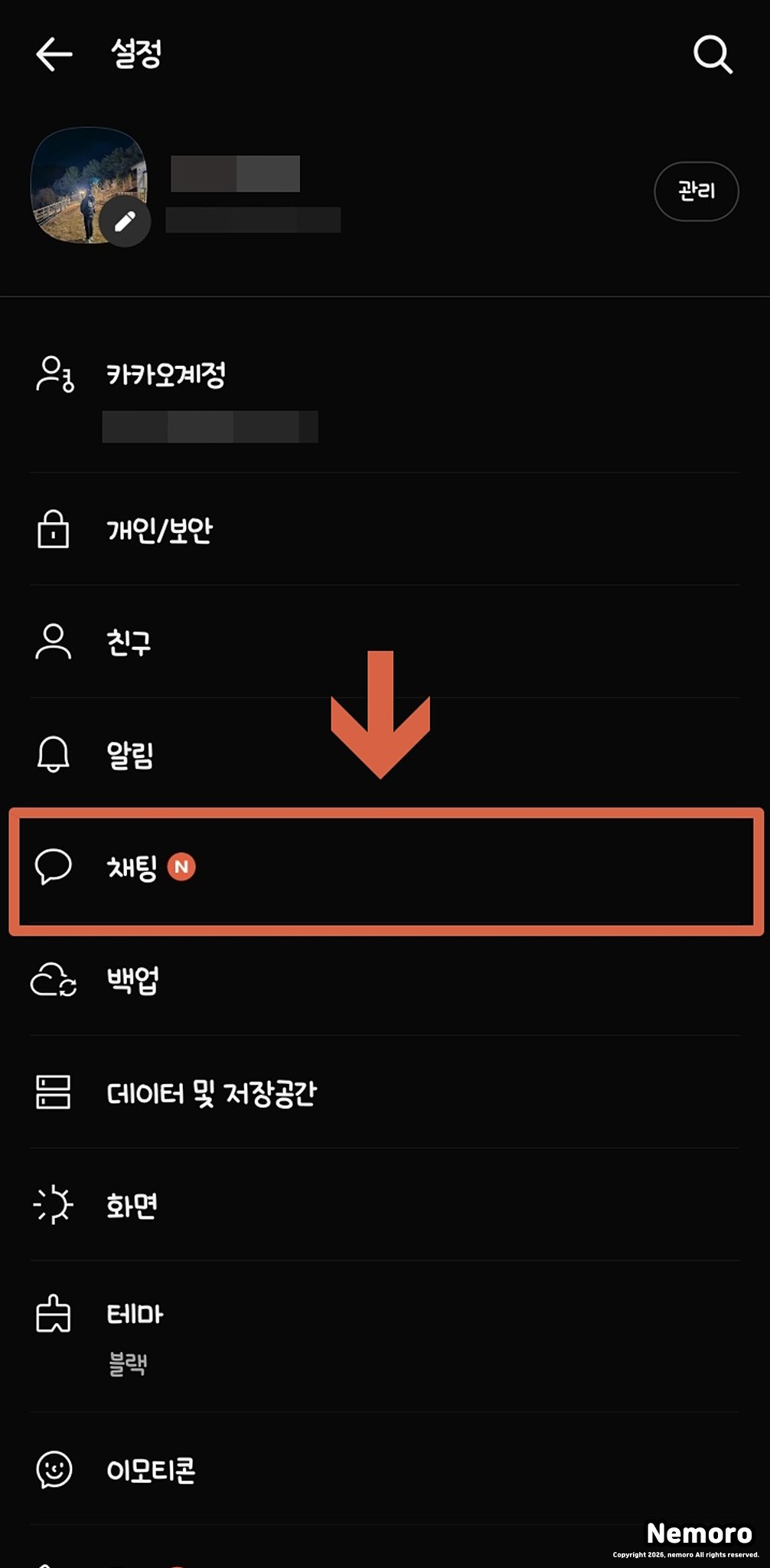 설정 진입 및 채팅 관리 메뉴 이동