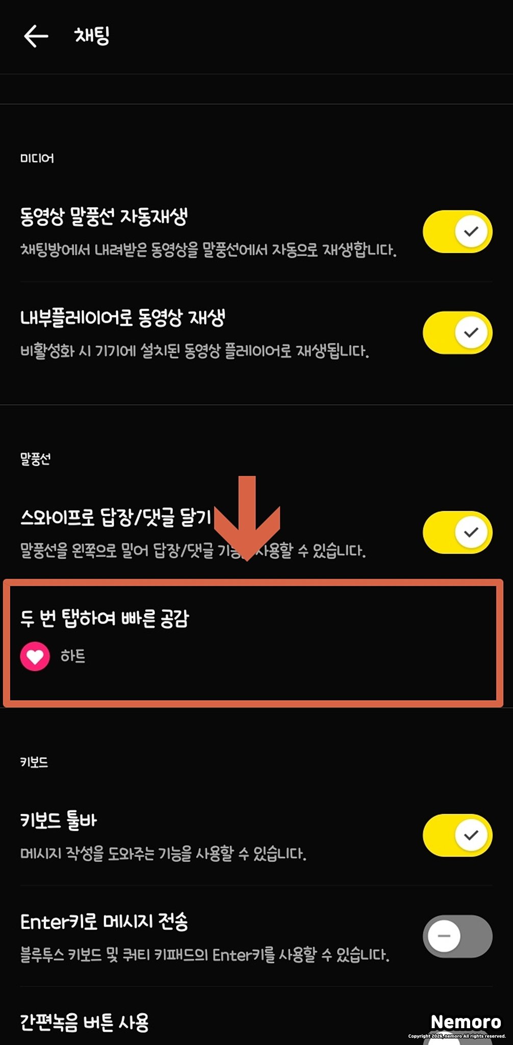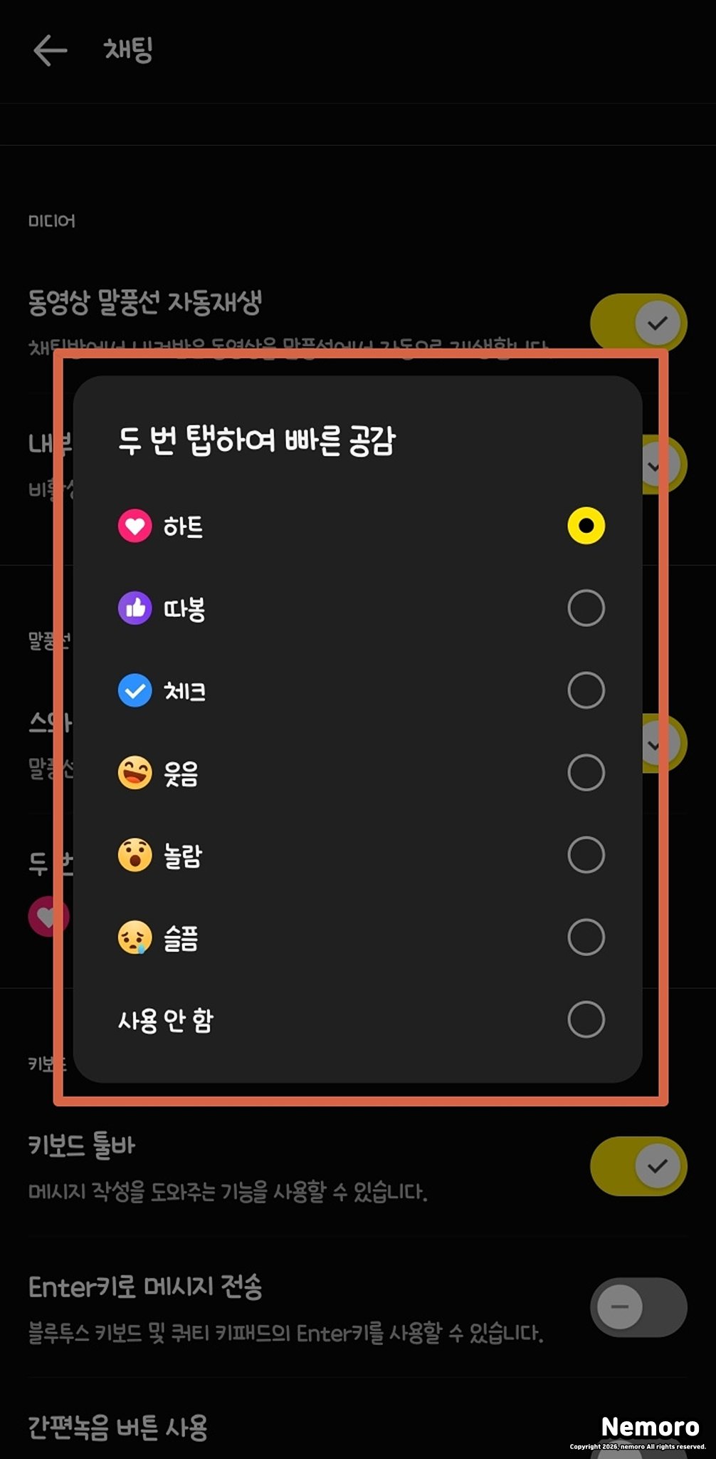 안녕하세요. 네모로입니다. 오늘은 카카오톡 빠른 공감 설정 방법, 두 번 탭 해서 하트 찍기에 대해서 블로그에 적어보려고 합니다.