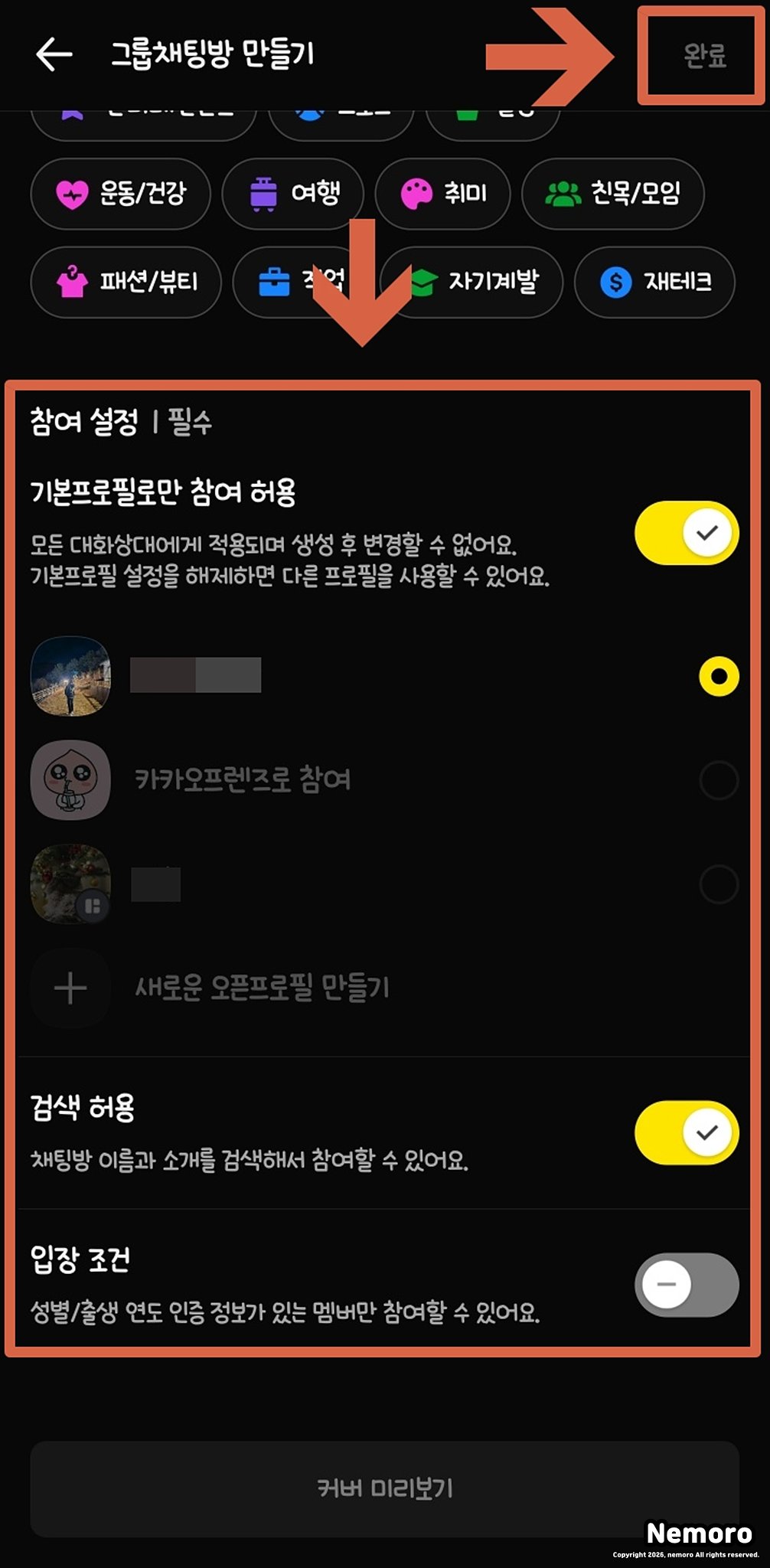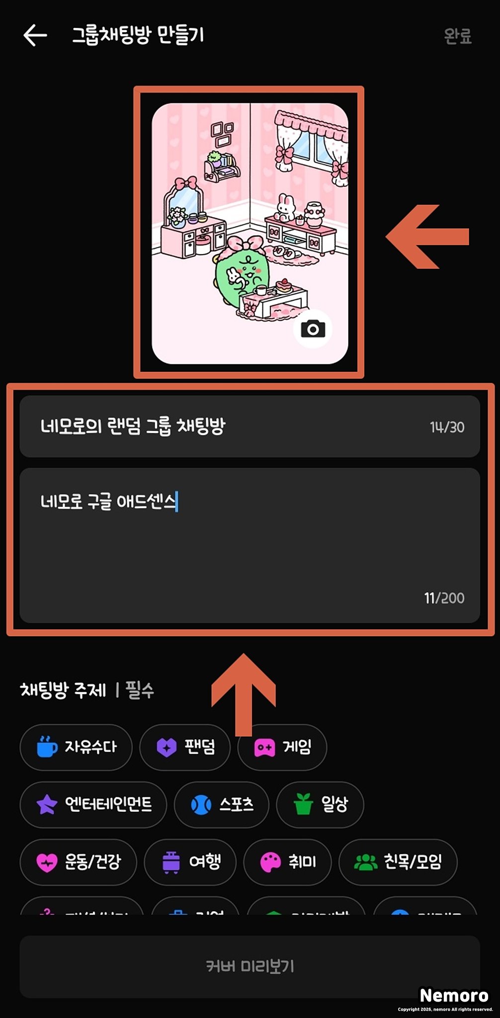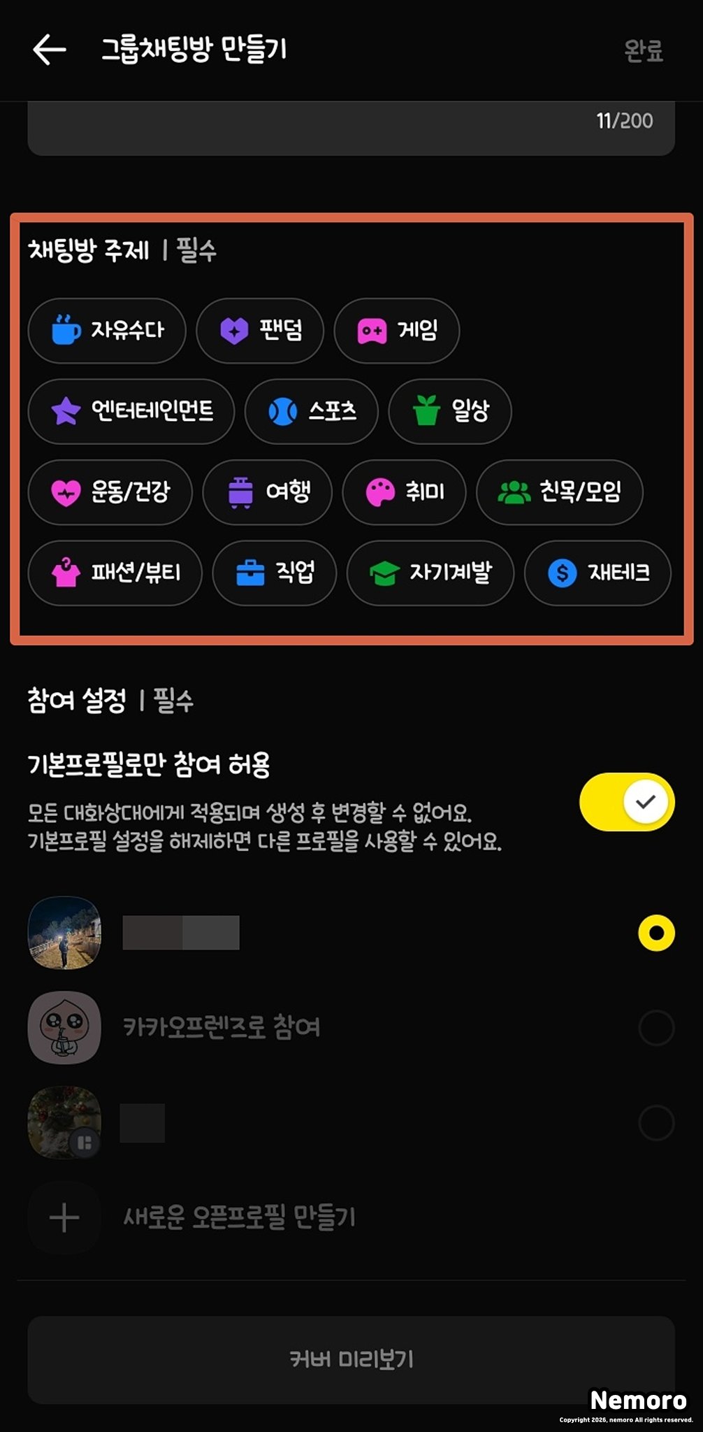 채팅방의 목적을 명확히 나타내는 제목을 입력하고 적절한 커버 이미지를 설정해 주세요. 검색 최적화를 위해 정확한 주제 카테고리를 선택해야 하며, 기본 프로필 참여 허용 여부를 결정하여 방의 성격에 맞는 멤버를 모집할 준비를 합니다.