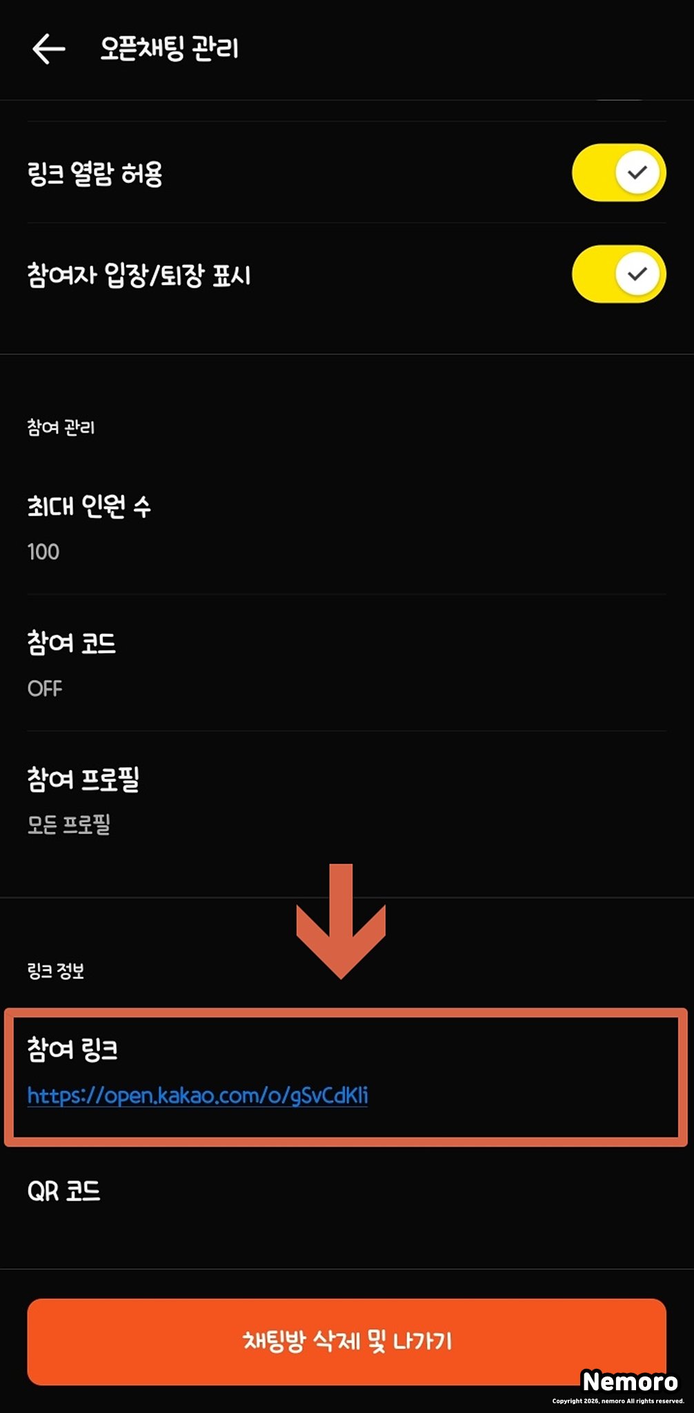똑같이 [링크 정보] 탭에서 QR코드를 선택하면 해당 오픈 채팅방의 QR코드가 생성됩니다. 이 코드를 저장하여 그룹 채팅방에 참여할 사람들에게 링크를 공유하실 수 있습니다.