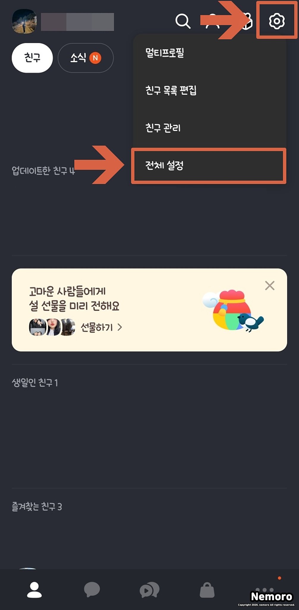 카카오톡 전체 설정 및 개인/보안 메뉴 진입