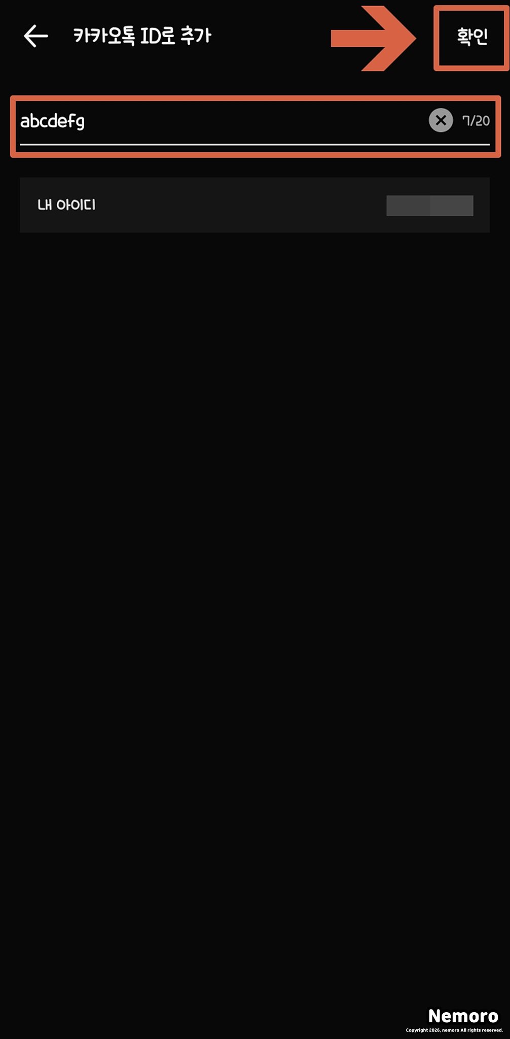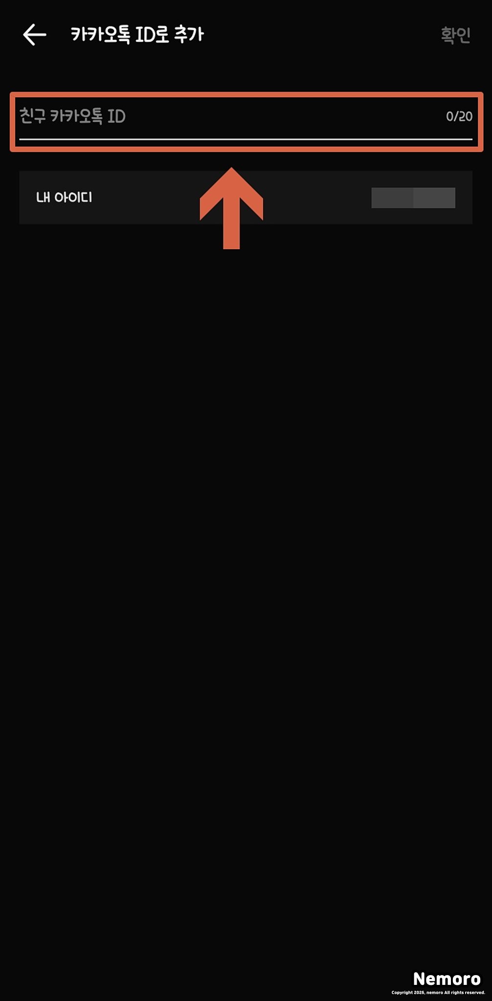 화면 중앙에 나타난 빈칸에 전달받은 상대방의 카카오톡 ID를 기입해 주세요. 오타가 없는지 한 번 더 꼼꼼하게 점검한 후, 우측 상단에 위치한 [확인] 버튼을 선택해 주시면 됩니다.