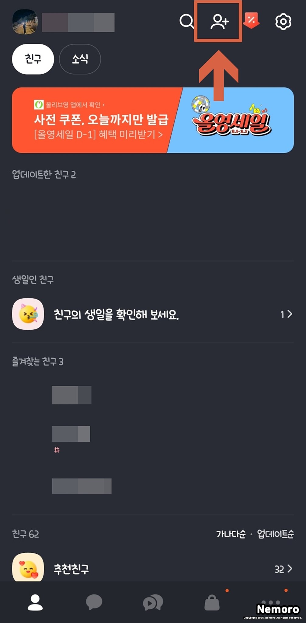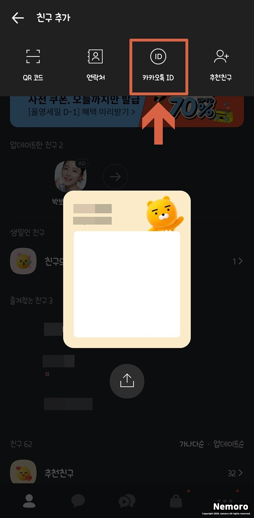 안녕하세요. 네모로입니다. 오늘은 카카오톡 ID로 친구 추가 및 내 아이디 찾기 검색 허용 설정 방법에 대해서 블로그에 적어보려고 합니다.