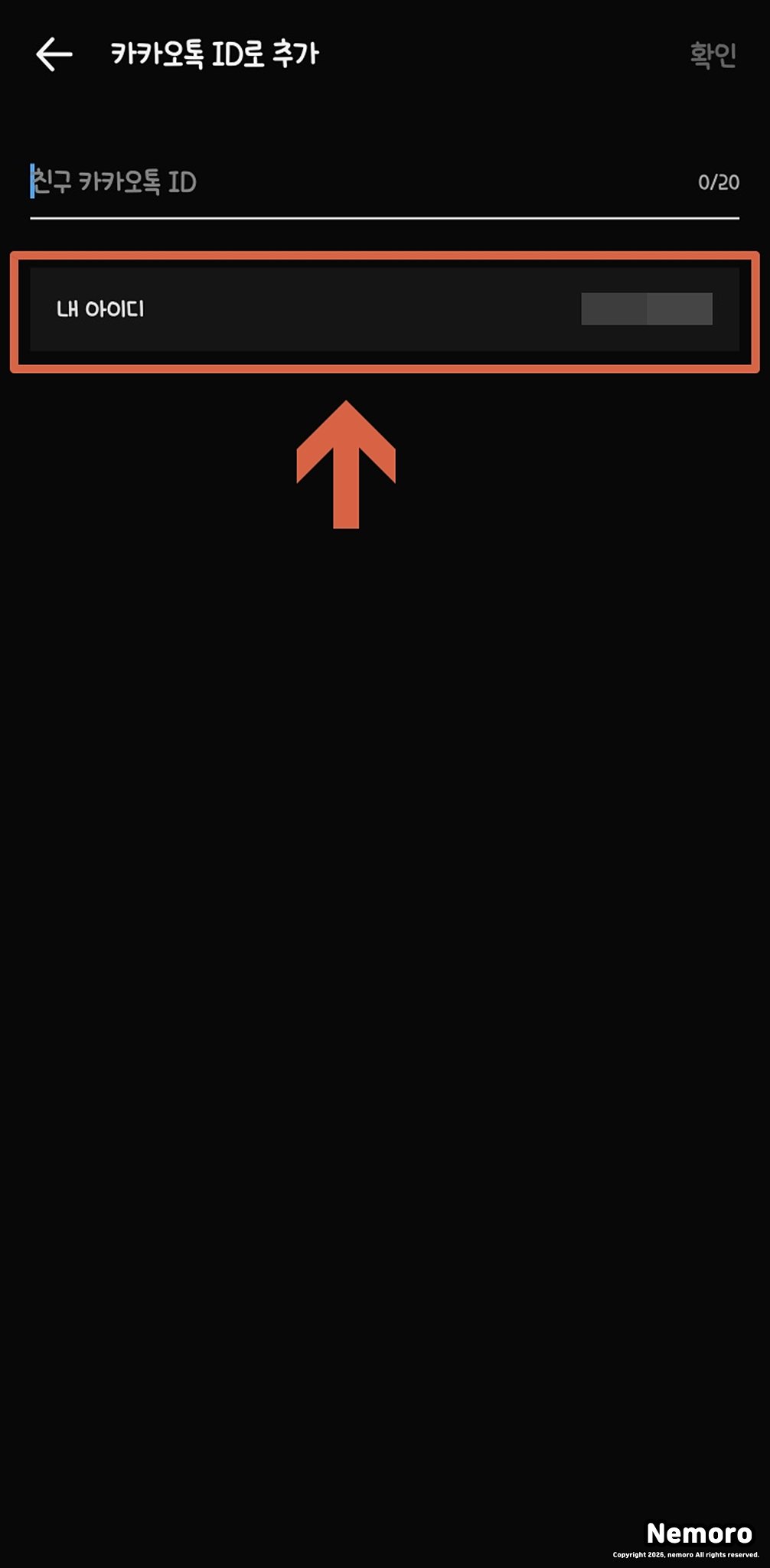 만약 본인의 카카오톡 ID가 기억나지 않는다면, 친구 카카오톡 ID 입력창 바로 아래에 표기된 공간에서 쉽게 파악할 수 있습니다.