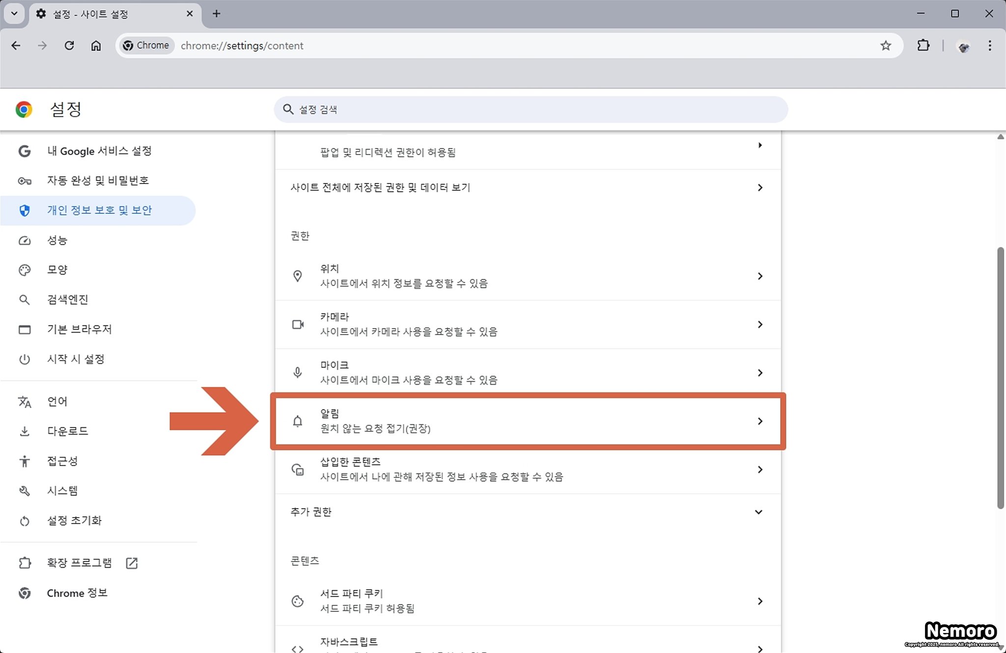 사이트 설정 페이지에서 아래로 스크롤하여 [권한] 탭에서 [알림]을 선택해 주세요. [알림] 설정에서는 크롬에 등록되어 있는 알림 사이트를 전부 확인할 수 있습니다.