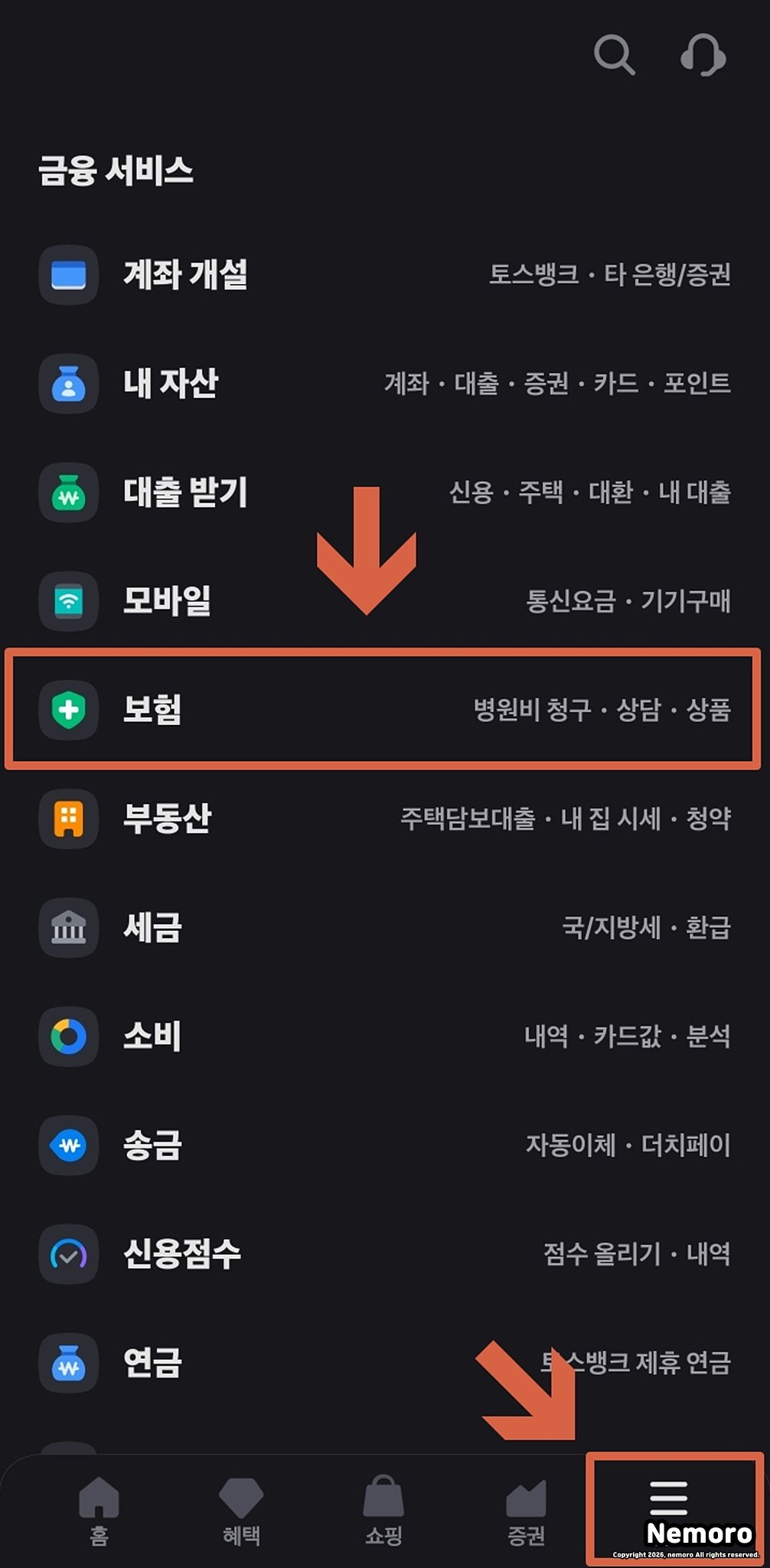 TOSS 토스 앱을 실행한 뒤 하단의 전체 메뉴 탭을 선택하면 다양한 금융 서비스 항목이 나타납니다. 여기서 [보험] 카테고리를 찾아 진입해 줍니다.