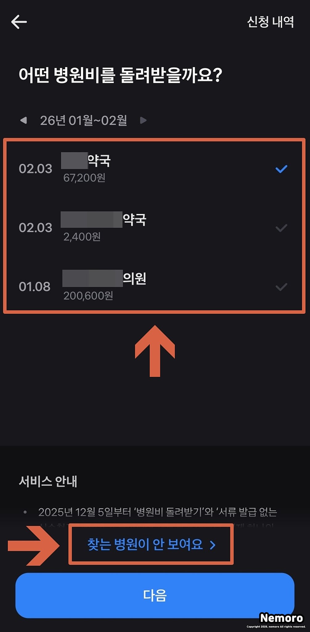 병원비 돌려받기 및 진료 내역 선택