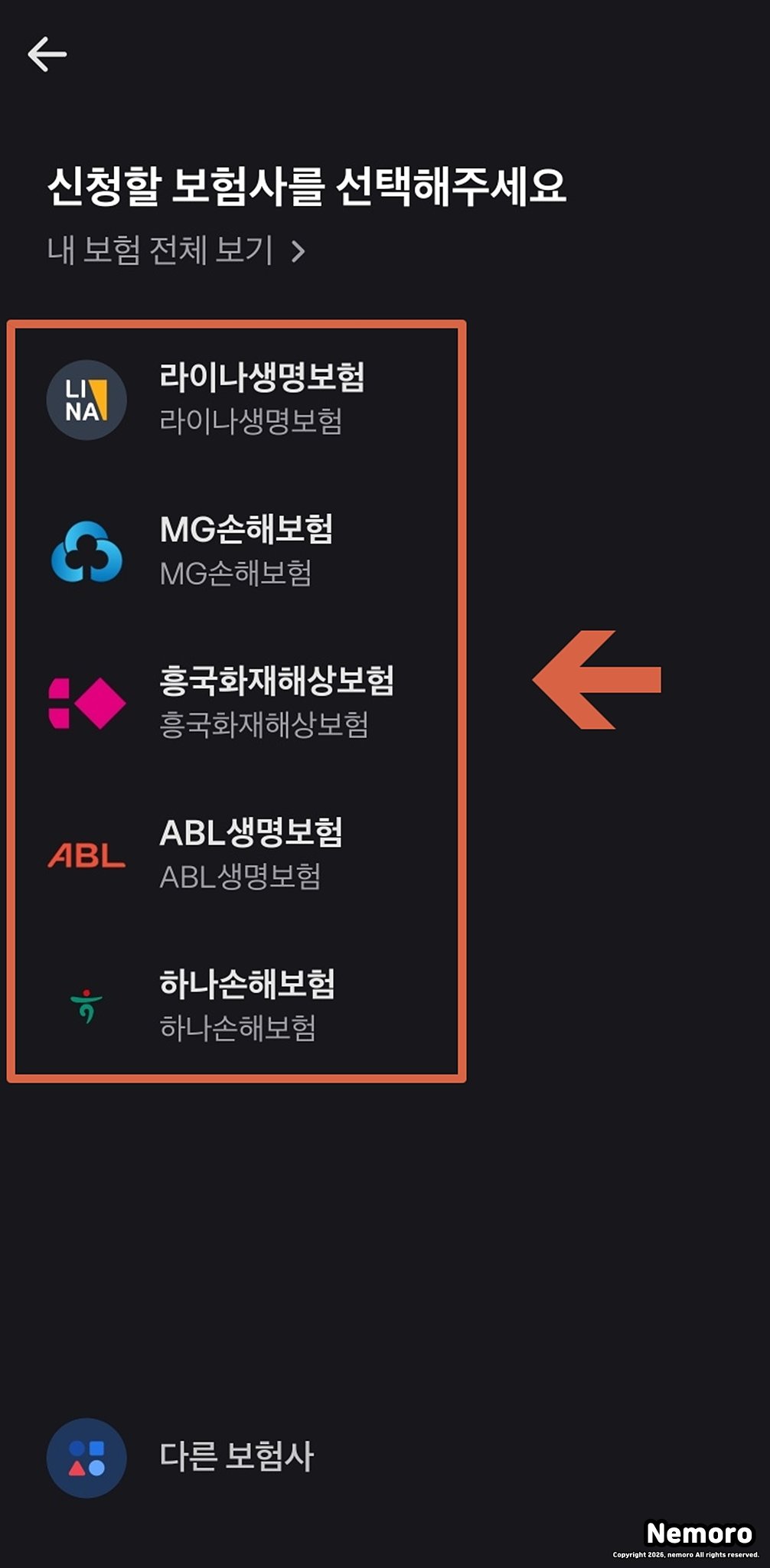 이제 서류를 접수할 보험 회사를 선택해 주세요. 이어서 진료를 받은 사람이 가입자 본인이 맞는지 묻는 알림 창이 뜨면, 본인일 경우 [네]를 눌러 다음 접수 과정으로 넘어가 주시면 됩니다.