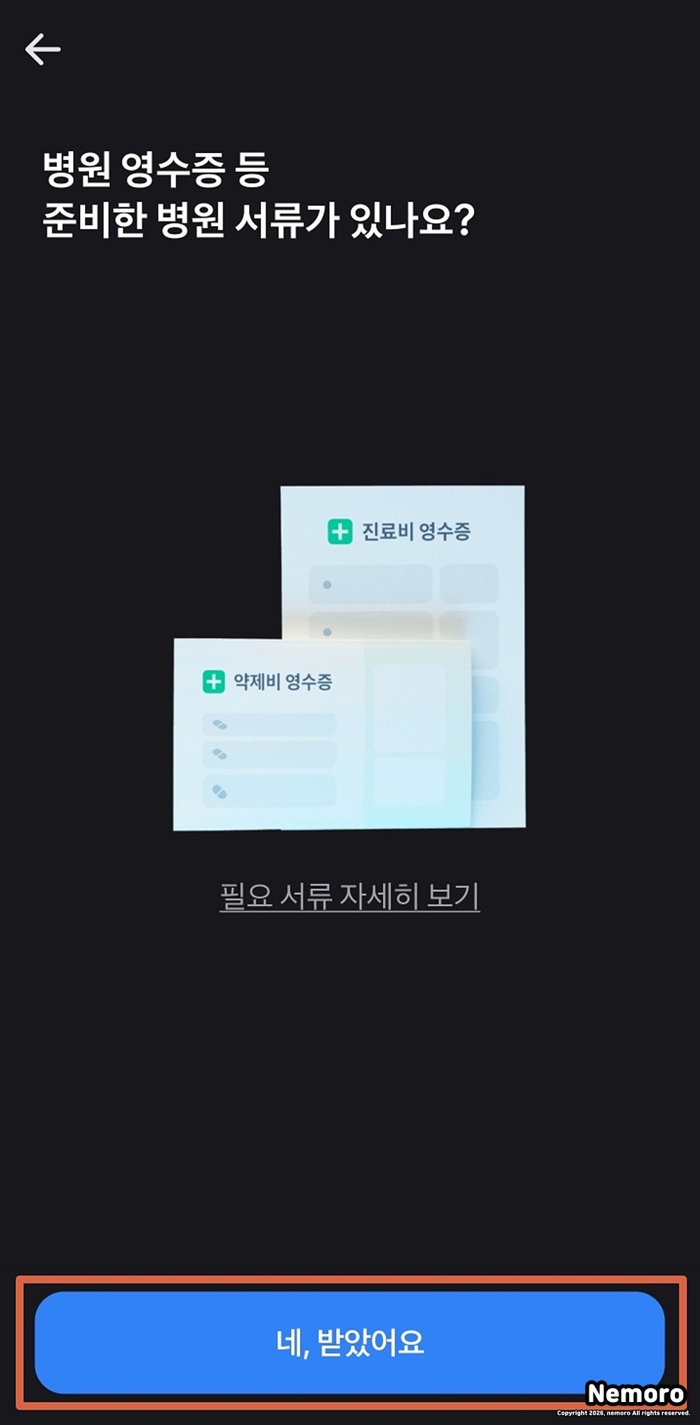 미리 발급받은 진료비 계산서나 약제비 영수증 등 필요 증빙 자료가 구비되어 있는지 묻는 화면이 나옵니다. 준비되었다면 파란색 [네, 받았어요] 버튼을 클릭해 주세요.