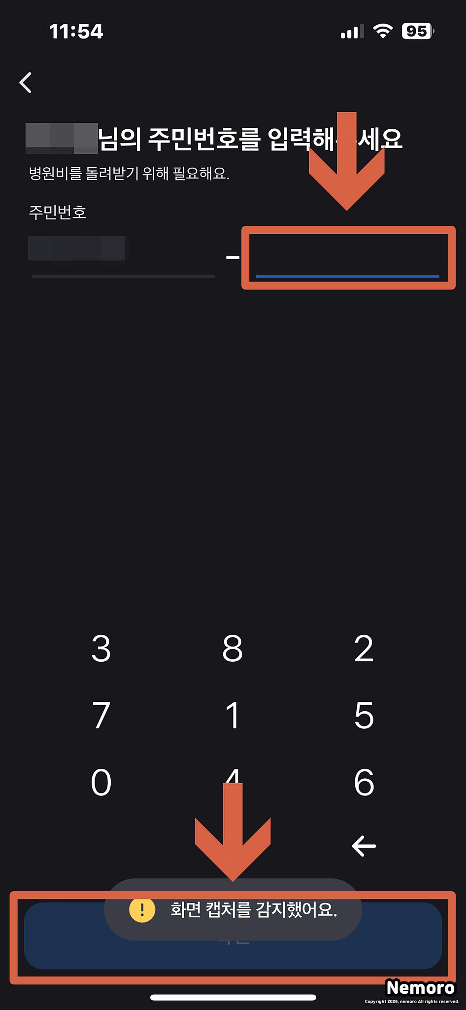 주민번호 뒷자리 입력 및 내원 이유 기재
