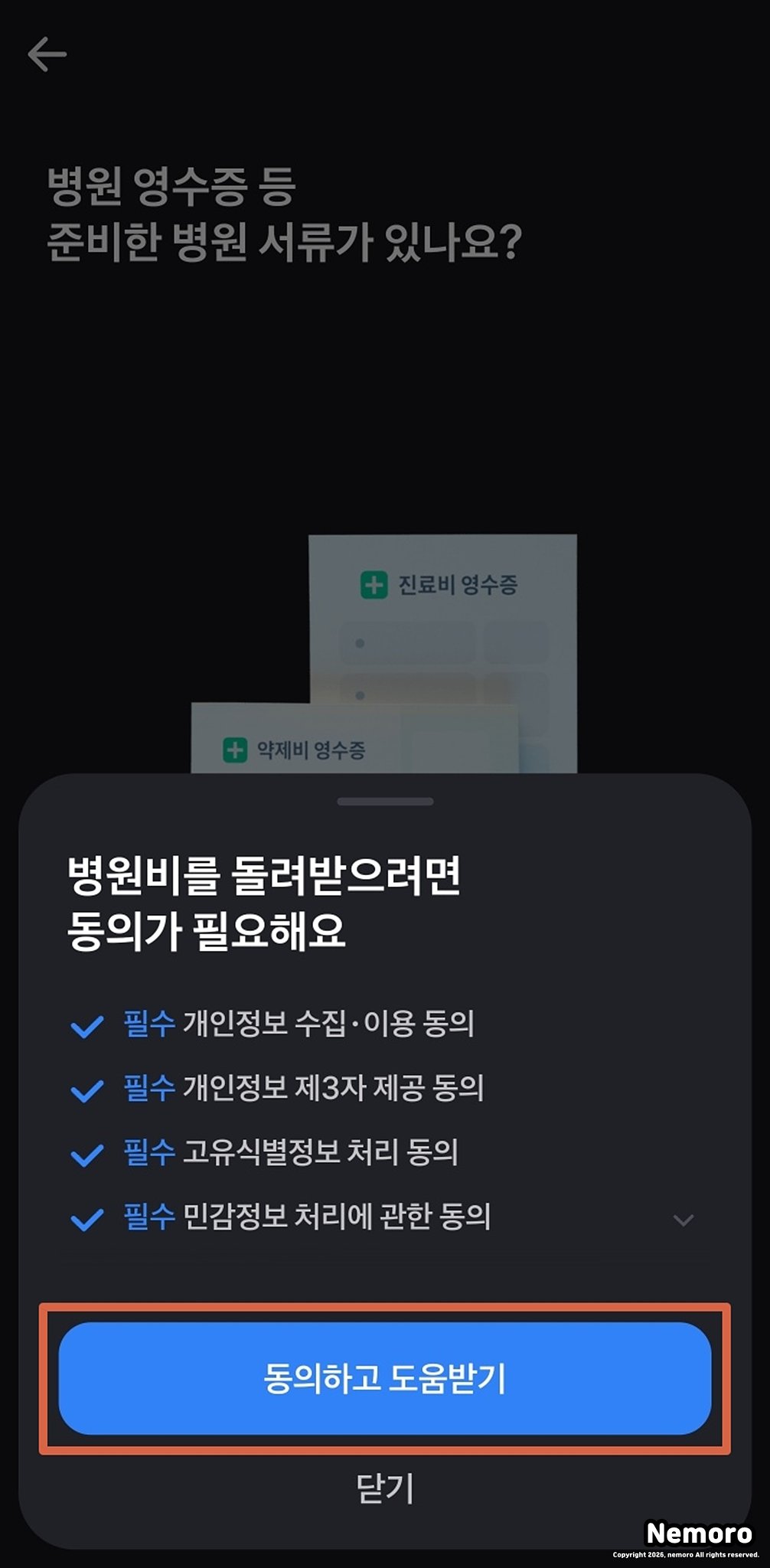 진료비 서류 준비 유무 및 개인정보 처리 수락