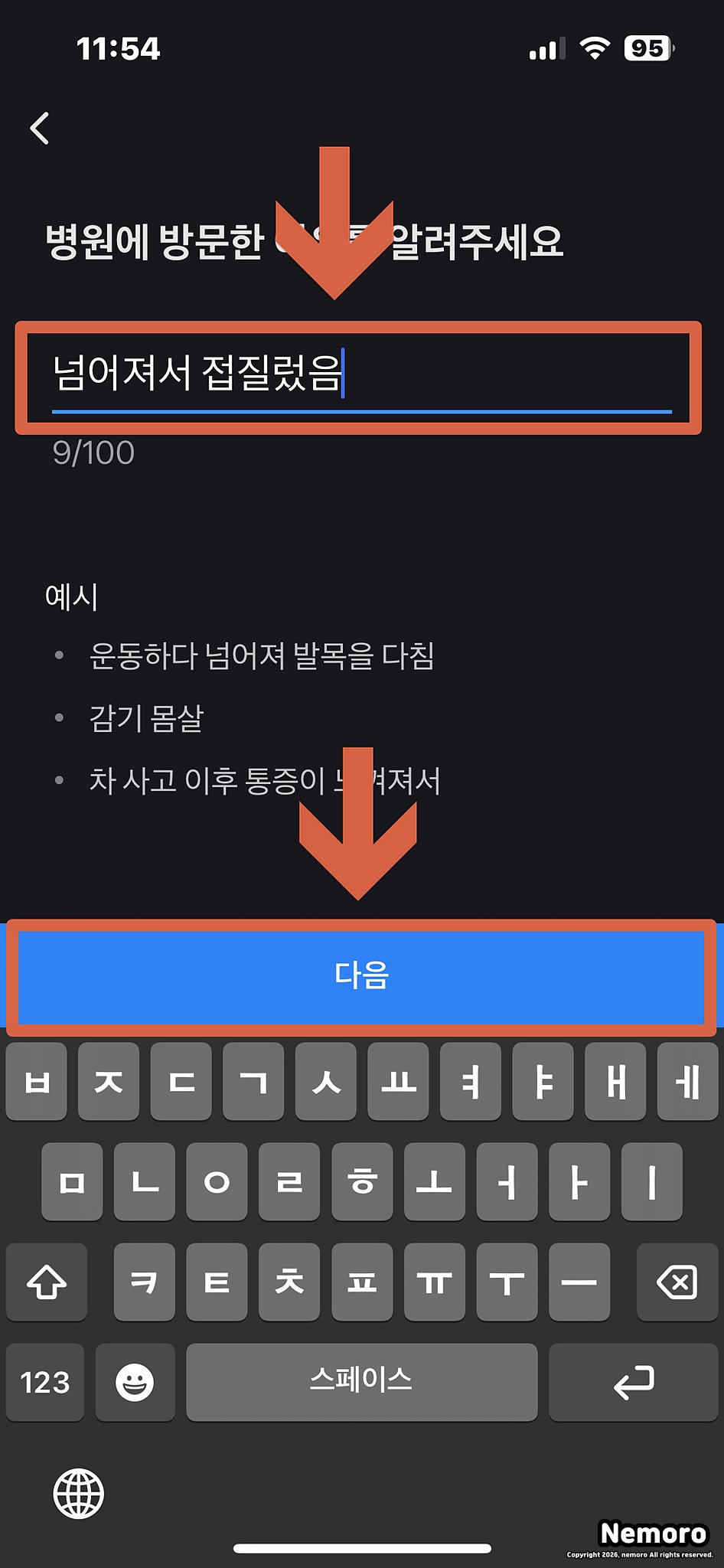 주민등록번호 입력 및 진료 사유 작성