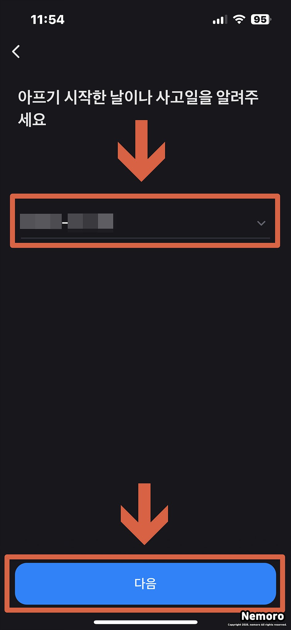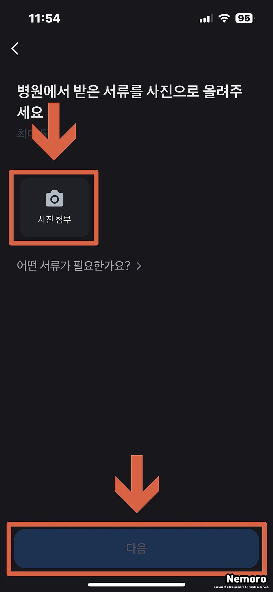 증상이나 통증이 시작된 날짜 혹은 병원에 방문한 날을 입력해 주세요. 그리고 가장 중요한 증빙 문서 제출 화면이 나타나면, 미리 찍어둔 갤러리의 사진을 불러오거나 카메라를 실행하여 선명하게 촬영한 뒤 반듯하게 첨부해 주시면 됩니다.