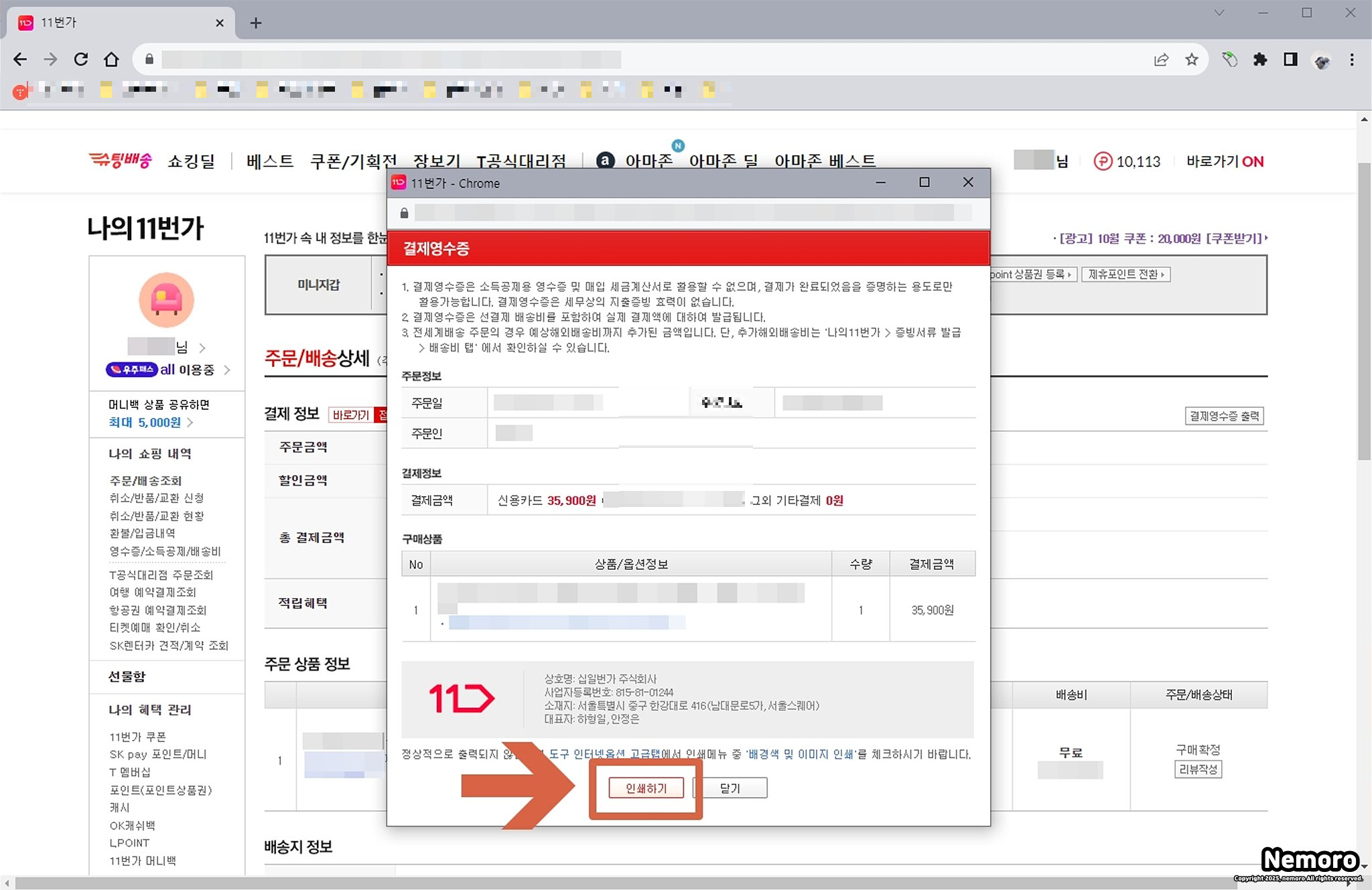 11번가 영수증, 거래 내역서 조회 및 출력하기