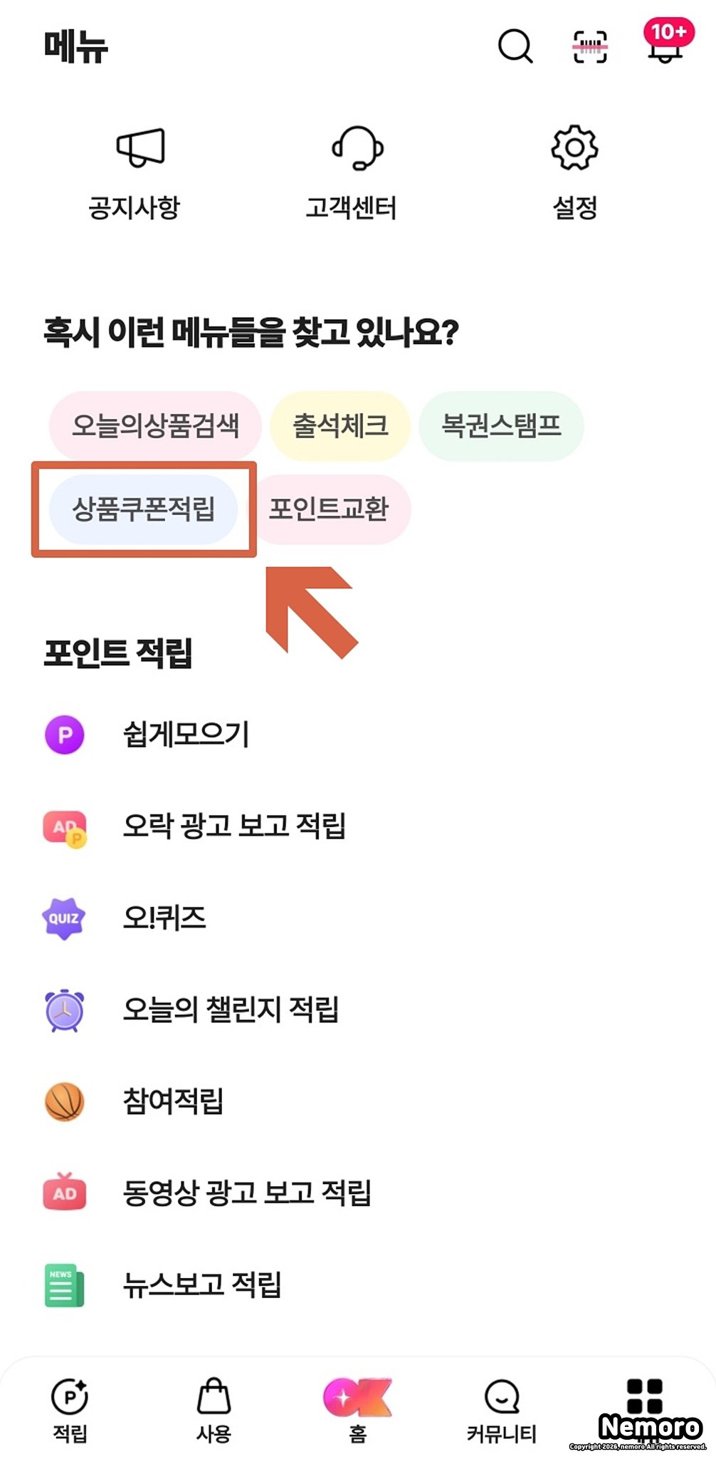 이후 화면에 나타나는 다양한 서비스 항목들 중에서 상단에 위치한 상품 쿠폰 적립 아이콘을 찾아 선택하시면 등록 화면으로 쉽게 이동할 수 있습니다.
