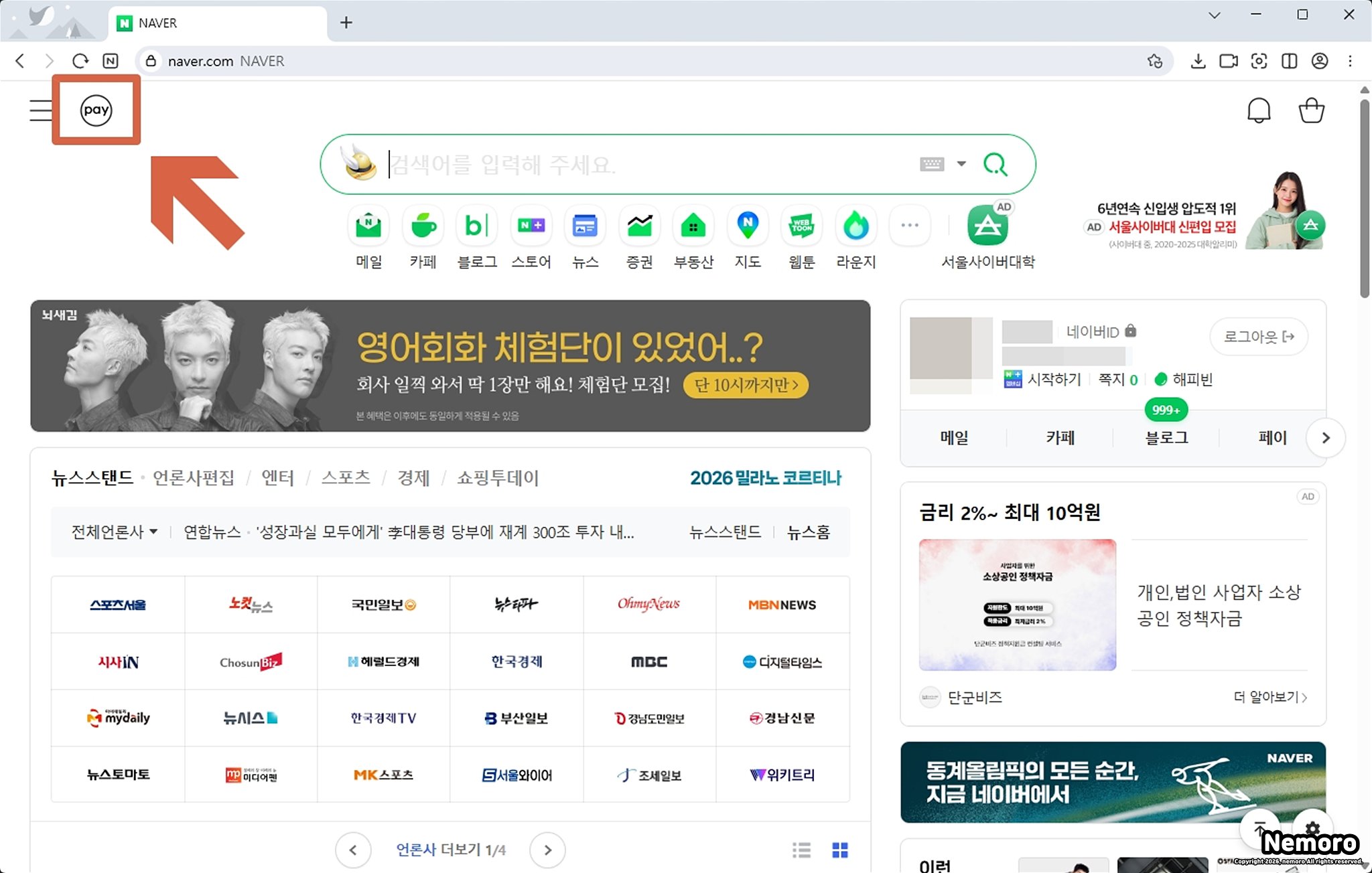 가장 먼저 PC 브라우저를 열어 네이버 메인 화면에 접속해 주세요. 로그인 후 왼쪽 상단 메뉴 버튼 바로 옆에 있는 [Pay] 아이콘을 클릭합니다.