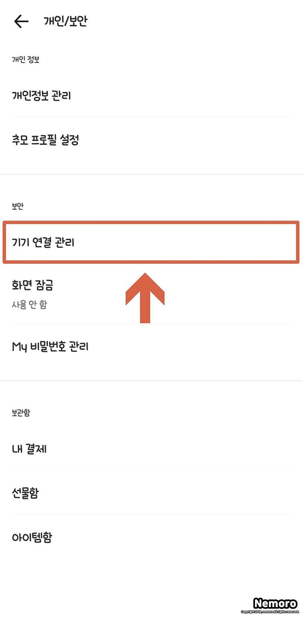 [개인/보안] 탭에 들어오셨다면 중간 지점에 위치한 [기기 연결 관리] 메뉴를 선택해 주세요. 이 메뉴는 현재 내 카카오톡 계정이 어떤 기기에 로그인되어 있는지 실시간으로 보여주는 아주 중요한 곳입니다.
